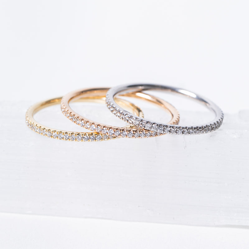 A delicate rose gold pave diamond eternity band. Perfect for everyday wear and looks fabulous worn alone or stacked.
